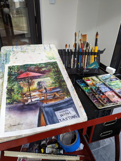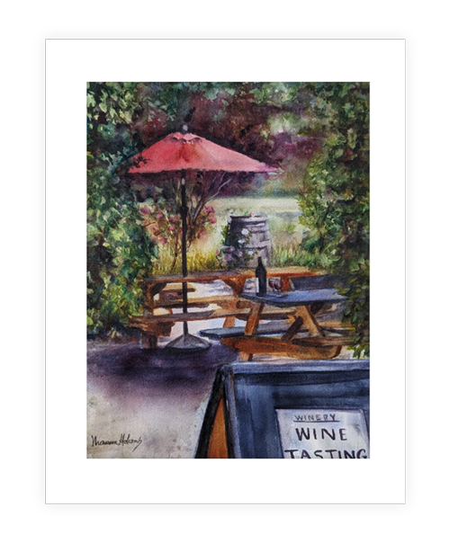"Wine Lovers" | 11"x14" watercolor painting of California winery landscape