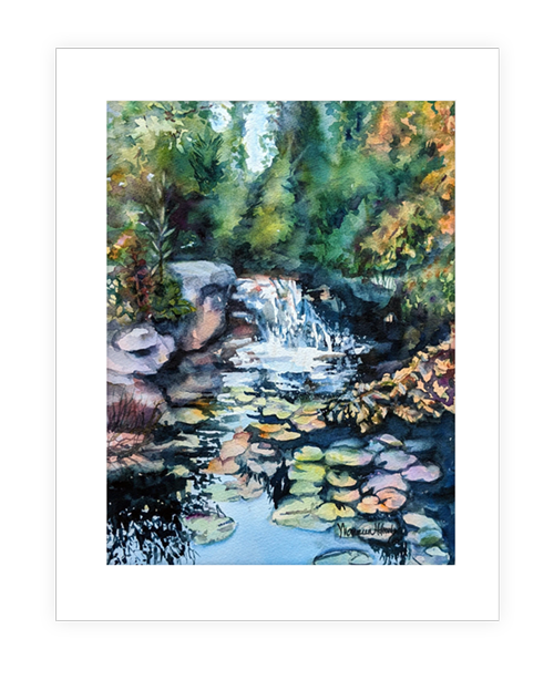 "Peaceful Waters" | 11"x14" watercolor painting of serene waterfall landscape