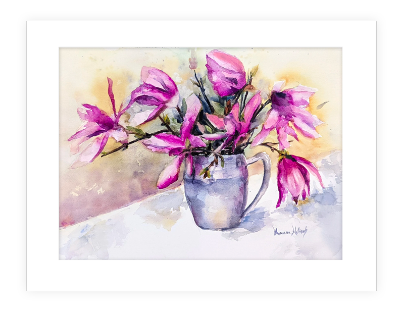 "Sweet Magnolias" | 14”x11” watercolor painting of spring magnolias in a pewter vase