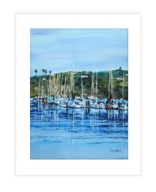 Experience the serenity and tranquility of a quiet harbor in Sausalito with this original watercolor painting. Featuring stunning reflections of sailboats, it beckons for someone to Take Ship and embark on a journey of wonder and discovery.
